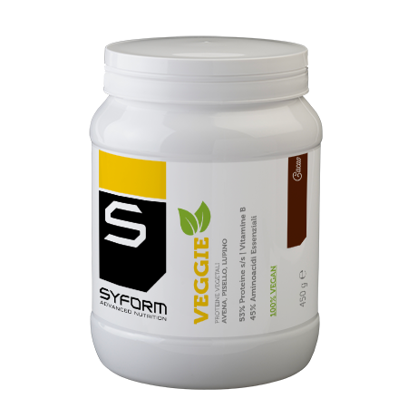 Veggie è un integratore alimentare in polvere a base di sole proteine vegetali provenienti da tre specifiche fonti: avena, pisello giallo e lupino, con aggiunta di vitamine del gruppo B che contribuiscono al normale metabolismo energetico e proteico, tra cui anche la B12, normalmente carente nei soggetti vegetariani. Le proteine sono un macronutriente essenziale per mantenere in perfetta efficienza l’organismo a tutte le età, indispensabili per contrastare la sarcopenia che si verifica con il progressivo invecchiamento. L’avena è un’ottima fonte di proteine la cui composizione è molto simile alla soia. Ha un’alta qualità nutrizionale e presenta una concentrazione di triptofano superiore rispetto ad altri cereali. La digeribilità è pari al 90%, comparabile a quella del riso e del grano. L’avena è ricca di sali minerali specialmente manganese, zinco, fosforo e di vitamina B1 e beta-glucani. Questi ultimi sono componenti della fibra alimentare utili nel regolarizzare l’attività intestinale e nel controllo del colesterolo . Le proteine di pisello sono ottenute direttamente dal legume, con una tecnologia che non necessita l’uso di sostanze chimiche. Il titolo proteico è pari al 85%, con percentuali di grassi e carboidrati molto basse ed una digeribilità del 97%. Il profilo aminoacidico del pisello è molto valido. Gli aminoacidi limitanti sono metionina e cisteina, in parte minore il triptofano. Il Lupino è una leguminosa tipica delle americhe che genera semi dall’alto contenuto proteico e grassi polinsaturi della serie Omega 3. Le proteine presentano una digeribilità pari al 90%. Lo spettro aminoacidico delle proteine isolate del lupino è meno completo di quello delle proteine di soia e pisello, soprattutto per la bassa presenza di aminoacidi essenziali come la lisina e il triptofano. INDICAZIONI: è indicato per integrare il fabbisogno proteico giornaliero in soggetti vegani, e intolleranti alle proteine del latte. INGREDIENTI: Proteine di Avena, proteine del Pisello giallo, Proteine del Lupino, *, Edulcorante: sucralosio, Vitamina B6 (Piridossina cloridrato), Vitamina B2 (Riboflavina), Vitamina B1 (tiamina cloridrato), Acido Folico, Vitamina B12 (Cianocobalamina). * GUSTO CACAO: Cacao in polvere, Aroma cacao, * GUSTO VANIGLIA: Aromi. MODALITA’ D’USO: Assumere in base alle proprie necessità 30 g al giorno (pari a 2 misurini rasi) sciolti in 200 ml di acqua, o altro liquido, preferibilmente lontano dai pasti principali. GUSTI: Cacao, Vaniglia